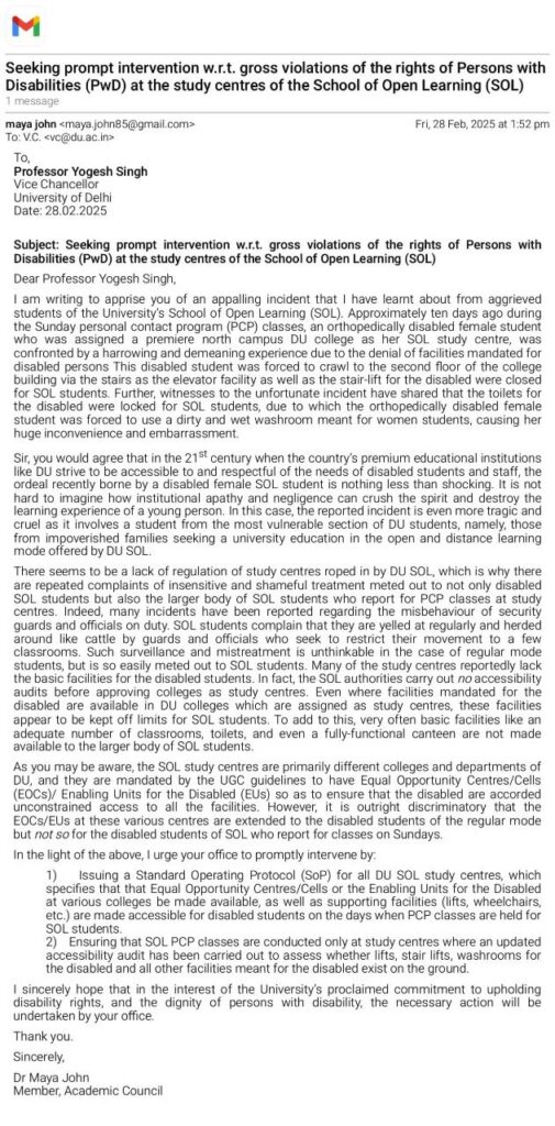 घटना के बाद इतिहास की असिस्टेंट प्रोफेसर माया जॉन ने वाइस-चांसलर योगेश सिंह को पत्र लिखकर पर्सन्स विद डिसेबिलिटी (PwD) छात्रों के लिए बेहतर सुविधाओं और एक्सेसिबिलिटी की मांग की है. पत्र में उन्होंने लिखा कि DU स्कूल ऑफ ओपन लर्निंग द्वारा चयनित अध्ययन केंद्रों में उचित नियमन और जवाबदेही की कमी है, जिसके कारण पर्सन्स विद डिसेबिलिटी छात्रों के साथ-साथ अन्य छात्रों को भी असंवेदनशील और अपमानजनक व्यवहार का सामना करना पड़ता है.
