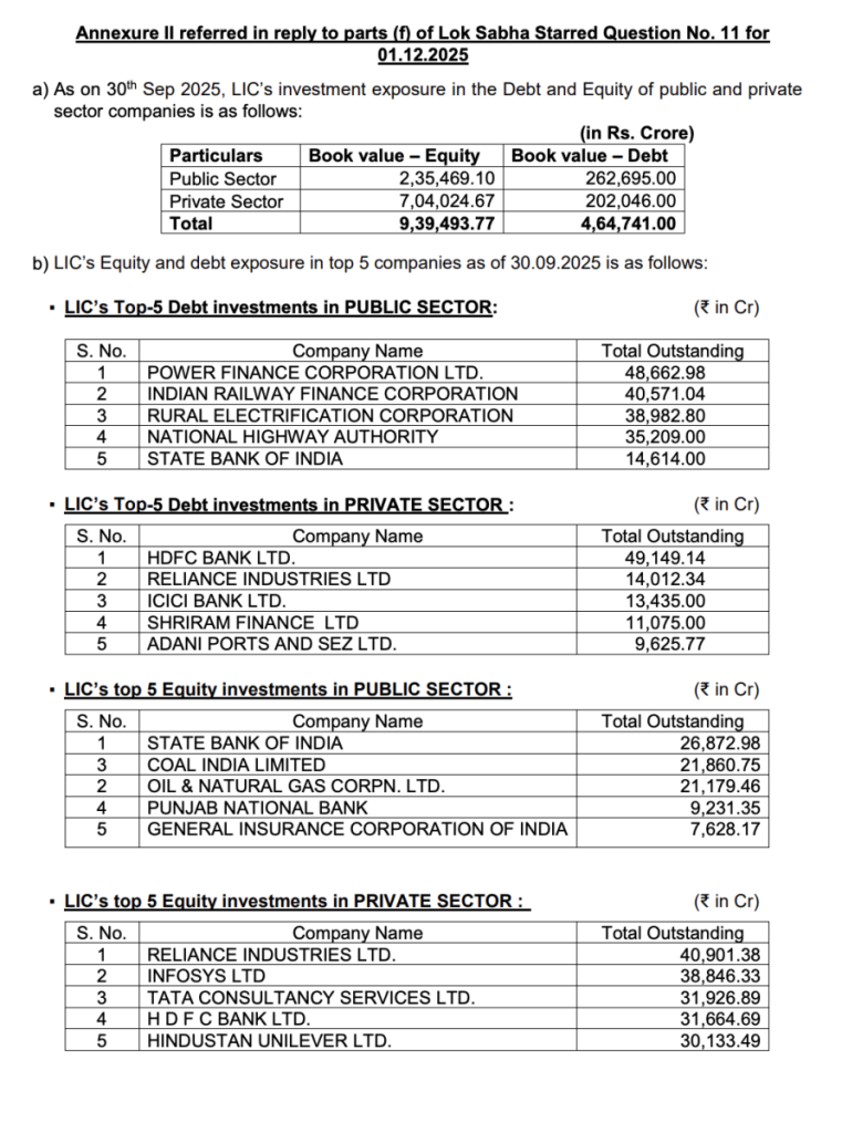 सरकार के जवाब में कहा गया है कि आम तौर पर एलआईसी के निवेश से यह स्पष्ट होता है कि वह एनएसई और बीएसई में सूचीबद्ध टॉप 500 कंपनियों में निवेश करती है और इनमें भी उसके ज्यादातर निवेश बड़ी कंपनियों में होते हैं. सरकार के अनुसार, 30 सितंबर 2025 तक निफ्टी-50 कंपनियों में एलआईसी के निवेश का बुक वैल्यू 4,30,776.97 करोड़ रुपये है, जो उसके कुल इक्विटी निवेश का 45.85% है.